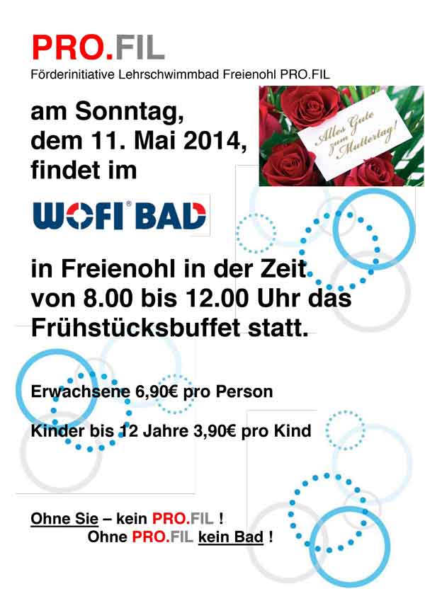 Am kommenden Muttertagssonntag, dem 11.05.2014, findet wieder im Freienohler Lehrschwimmbad in der Zeit von 8.00 bis 12.00 Uhr das Frühstücksbuffet statt.