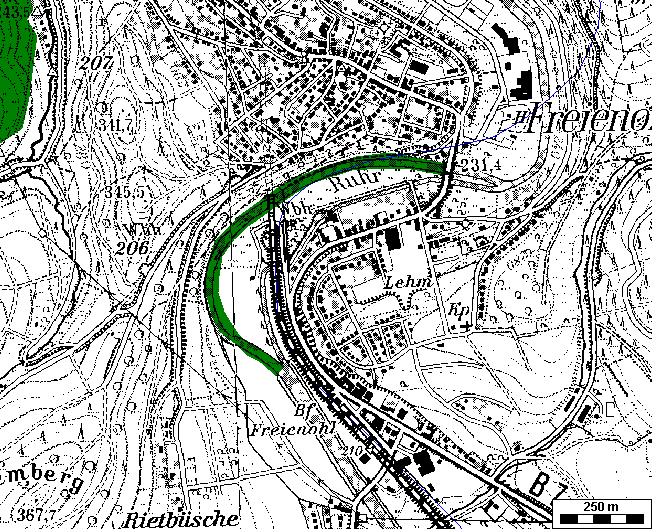 | Gebietsbeschreibung | Ruhrbogen südlich von Freienohl. Südlich des Gebietes liegt ein größeres Wehr, so dass der Fluss zu einem sehr langsam fließenden Gewässer angestaut wird. Stellenweise sind bis 1 m hohe Uferabbrüche, vegetationsarme Schotterbänke und Sand-Anlandungen ausgebildet. Flussbegleitend hat sich zumeist eine bis zu 6 m breite Ufer-Hochstaudenflur entwickelt, die der Ruhr eine Bedeutung als Bruthabitat für Enten gibt. Durch starke Wasserableitung am Wehr ist der Wasserstand der Ruhr unterhalb der Staustufe recht gering. Gut entwickeltes Ufergehölz und Hochstaudenfluren dringen lokal weit in Richtung Flussmitte vor. Dem aus bis zu 15 m hohen Bäumen bestehenden Ufergehölz sind auch einzelne Sträucher beigemischt. Im Gebiet kommt folgender Par. 62 Biotoptyp vor: - Naturnaher Mittelgebirgsfluss (FO1, wf) |